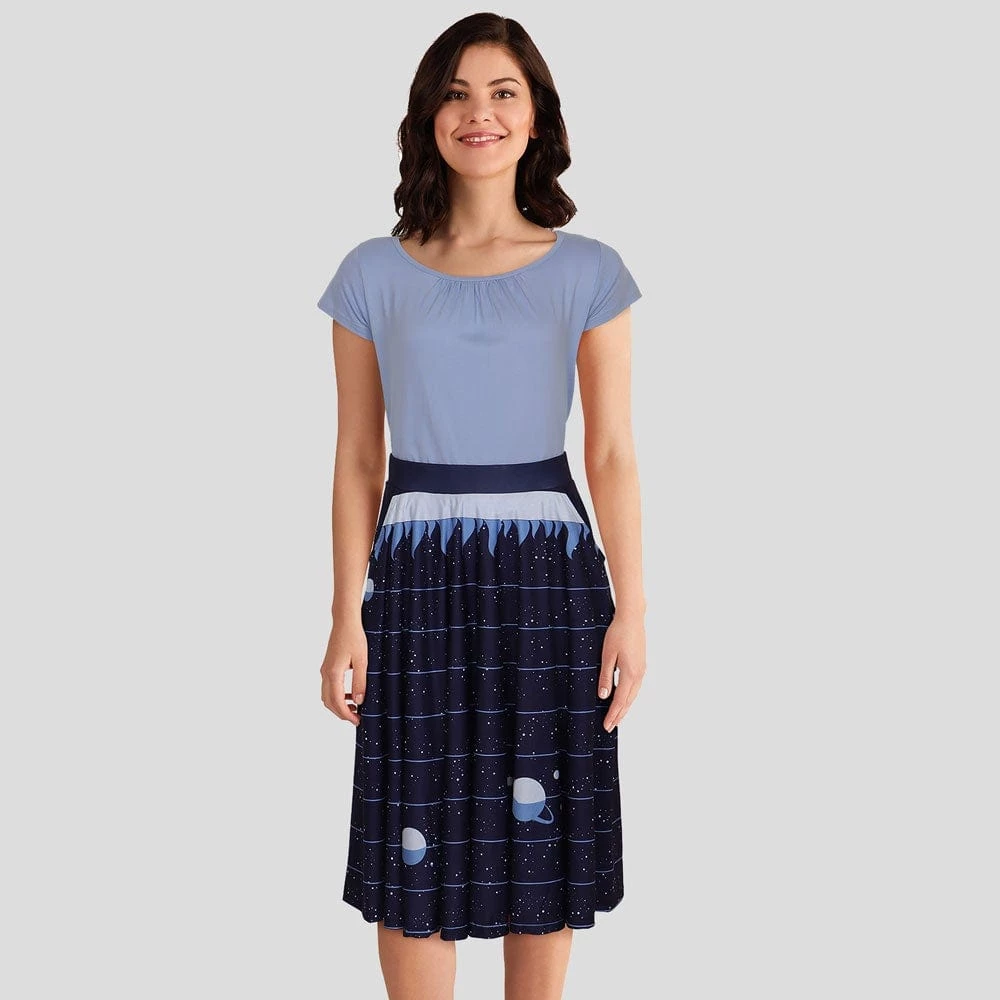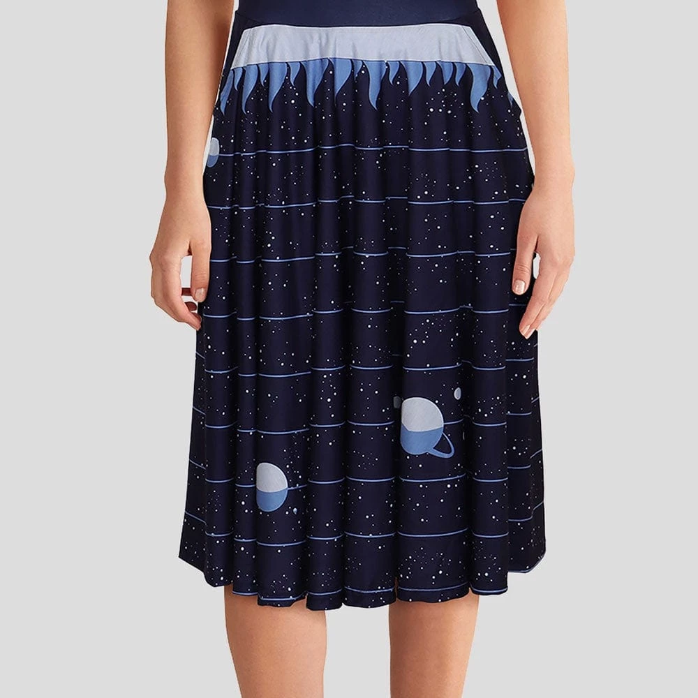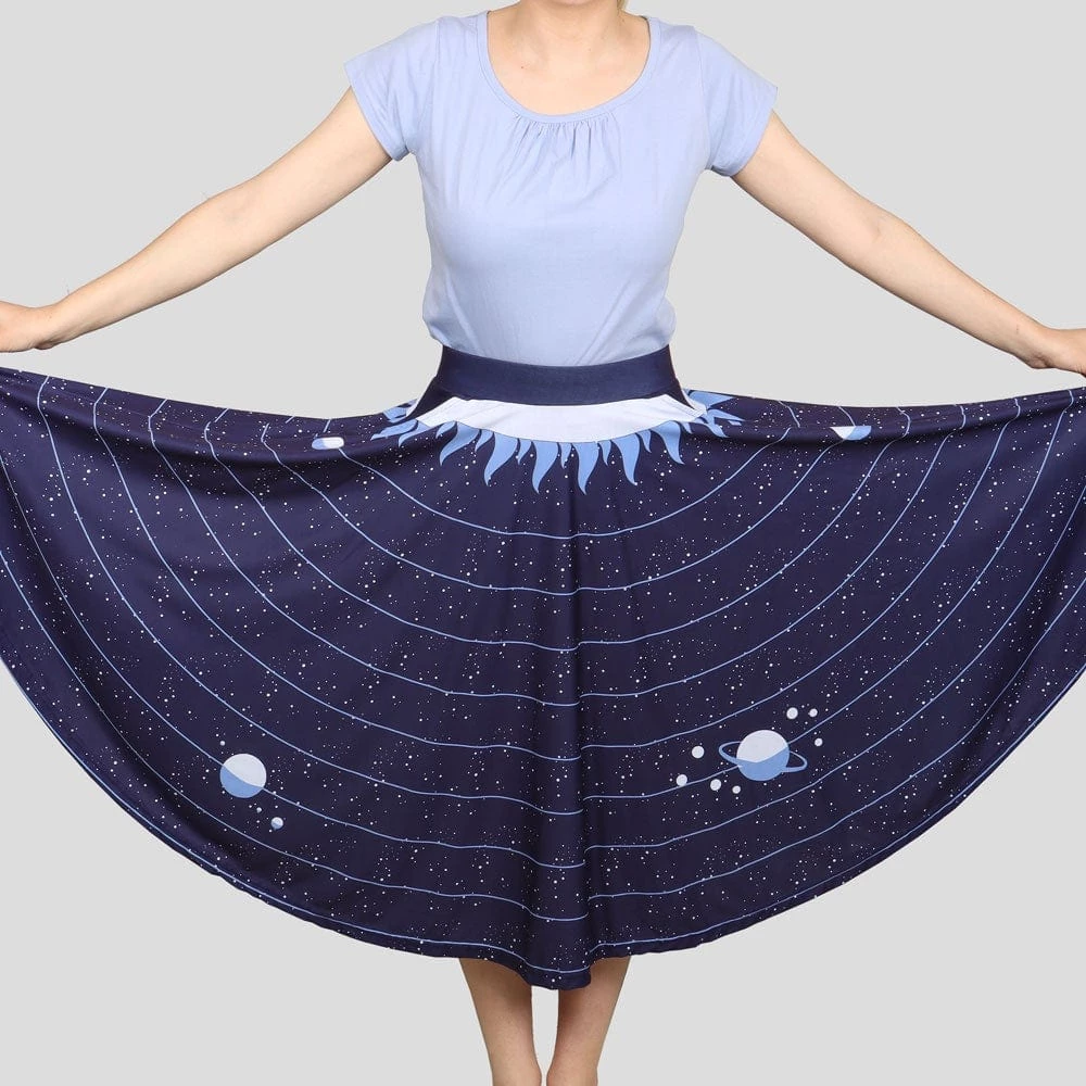 The order of the planets in the solar system, starting nearest the sun and working outward is Mercury, Venus, Earth, Mars, Jupiter, Saturn, Uranus, and Neptune. Take a trip around the rings, although not physically, it is fun to think about. Give this skirt a twirl and let the planets soar around you!