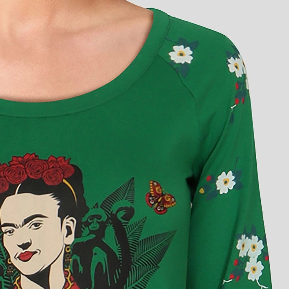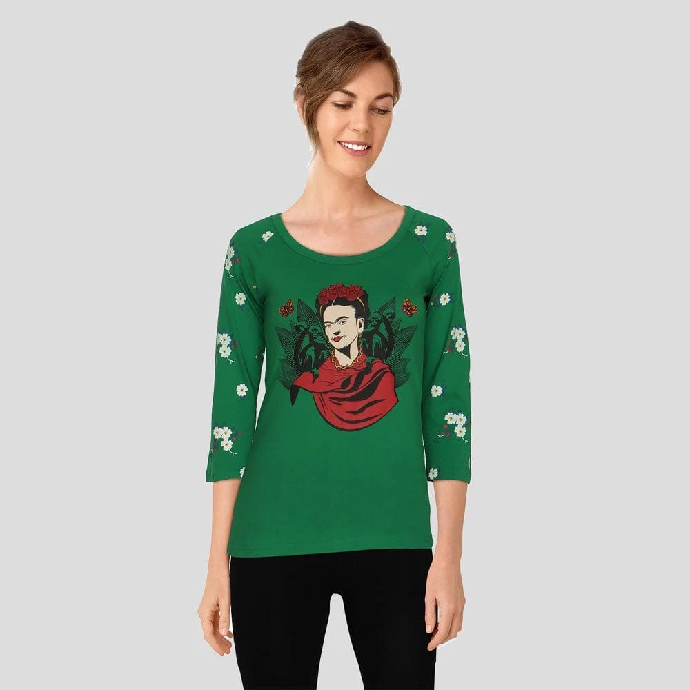 Many remember Frida Kahlo as an amazing artist who shared her passion and pain with vibrant colors that paid attention to indigenous culture and the real depiction of the female form. The paintings she created speak for themselves, that everyone should live life to the fullest, visualize everything within it as part of a whole. Frida’s iconic paintings now influence posters, pins, calendars, dolls and so much more. Become passionately inspired and remember Frida Kahlo while wearing this beautifully designed top!