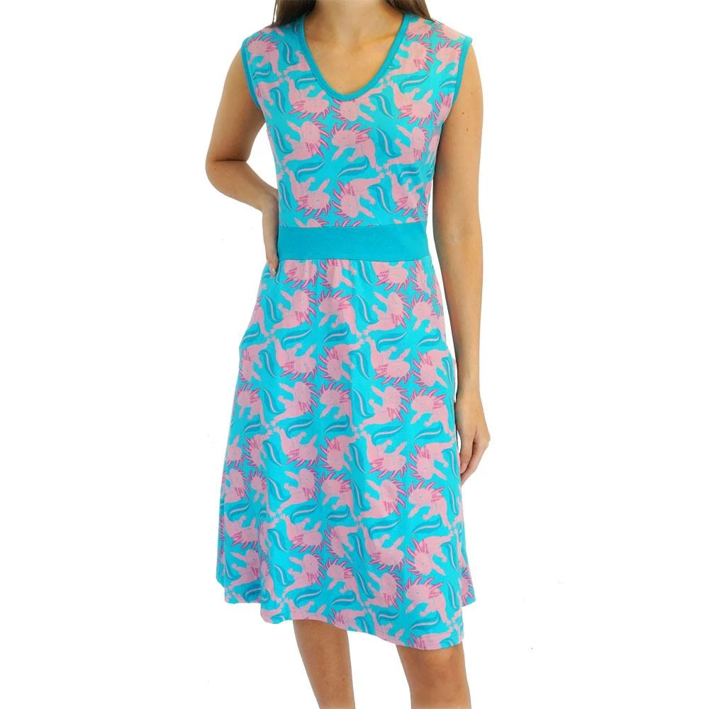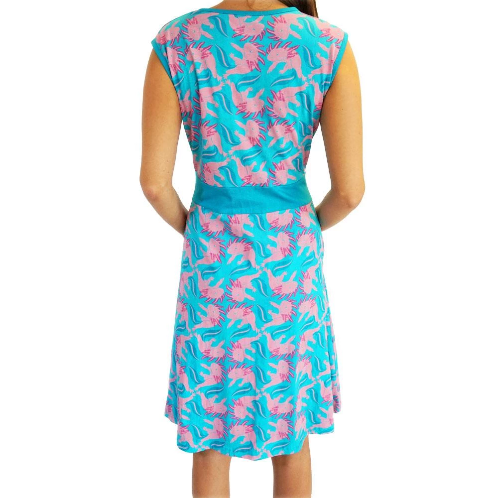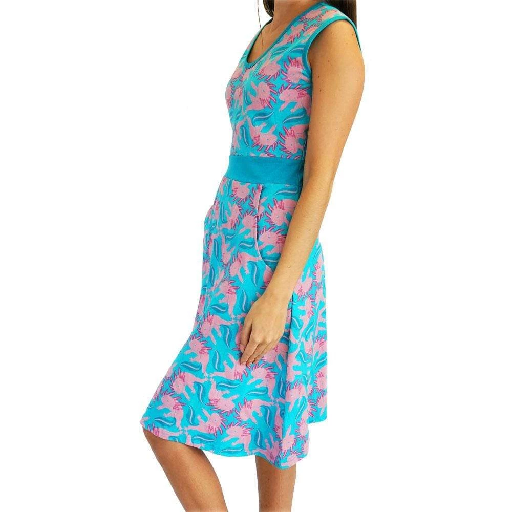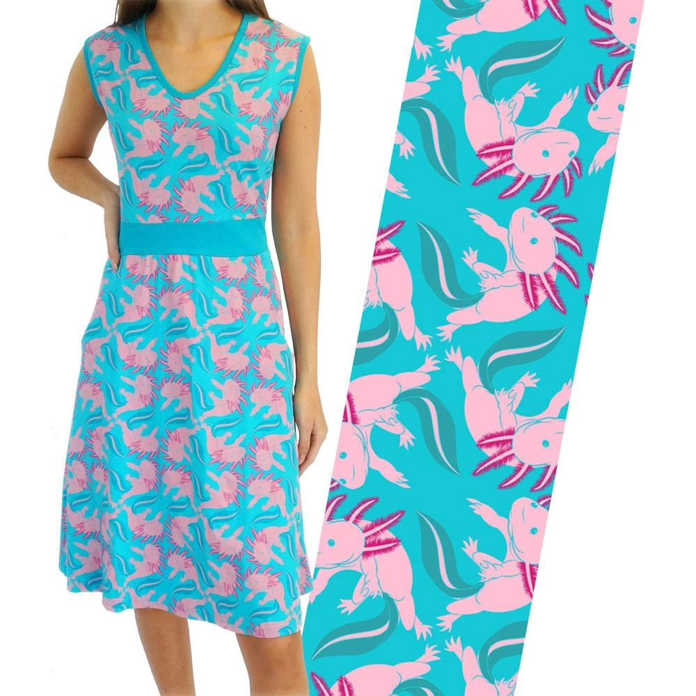 - Turquoise fabric is screen-printed with axolotl all-over-print design featuring a pink waistband