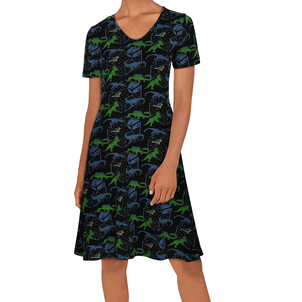 - Short sleeves, fit & flare dress with scoop v-neckline