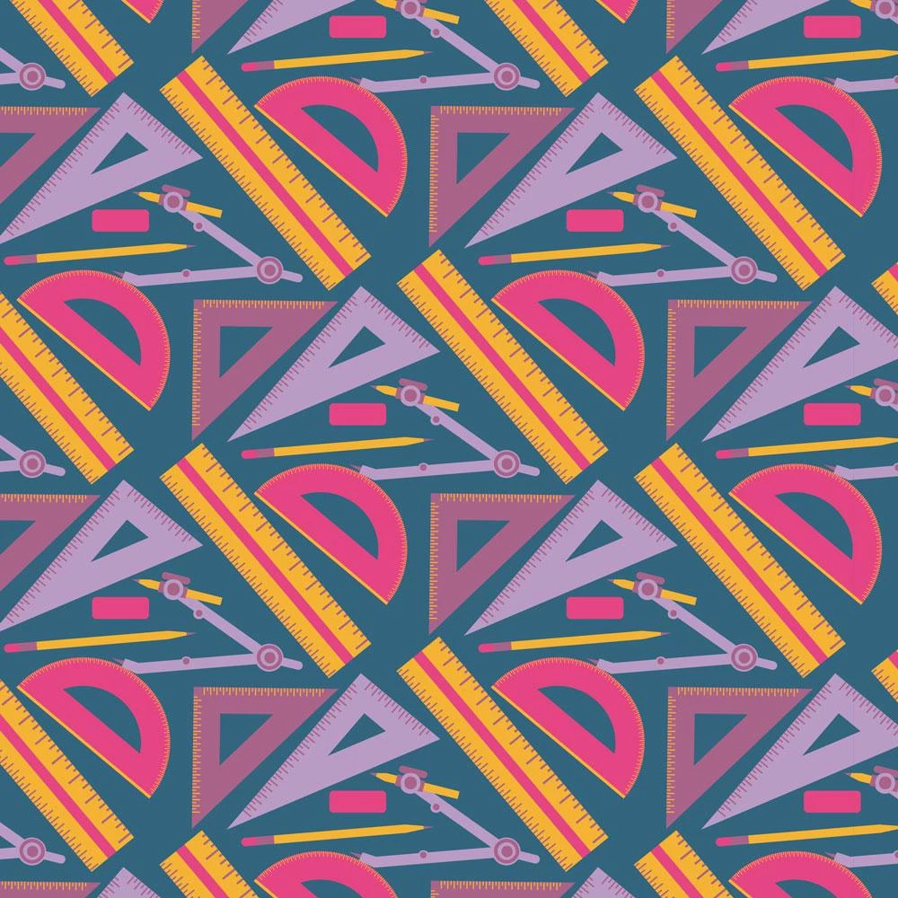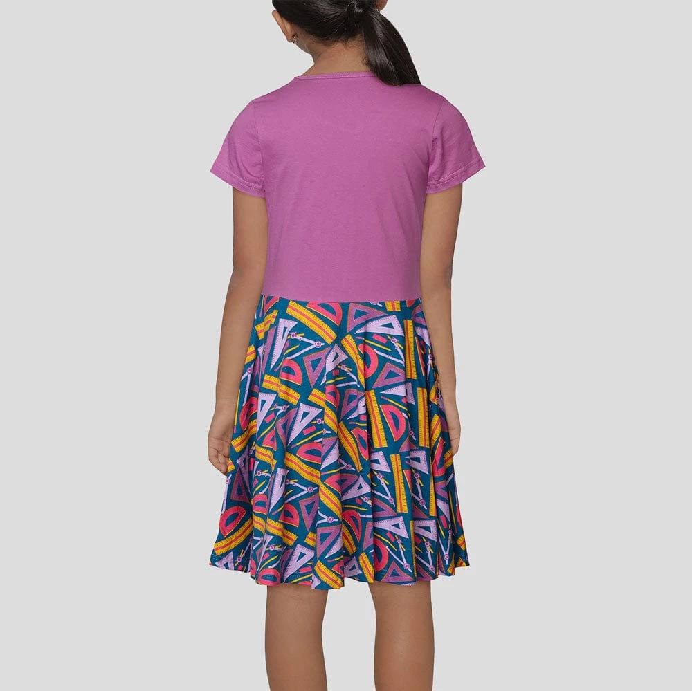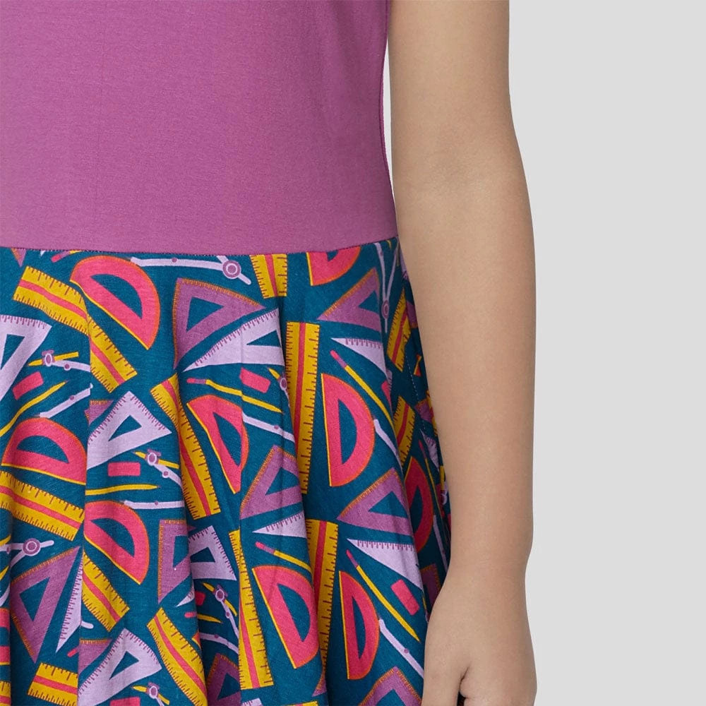 - Light purple top with printed skirt featuring pink, purple and yellow mathematical instruments