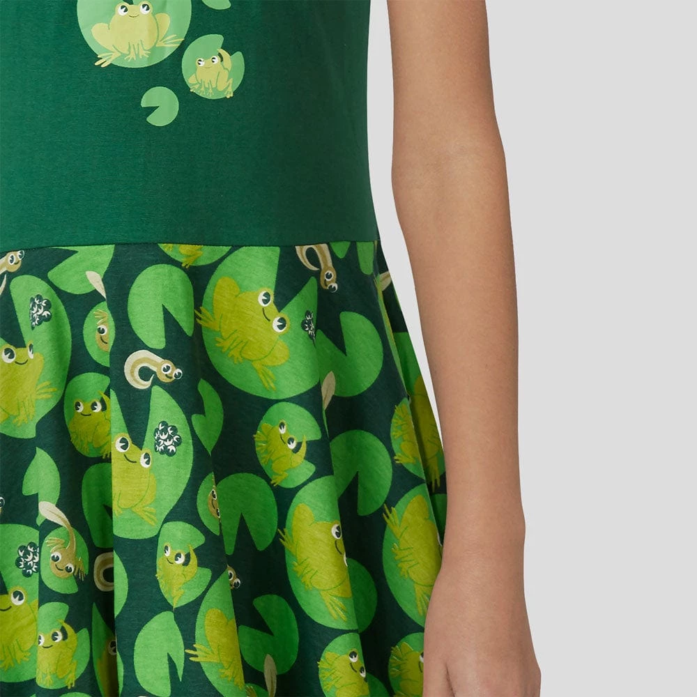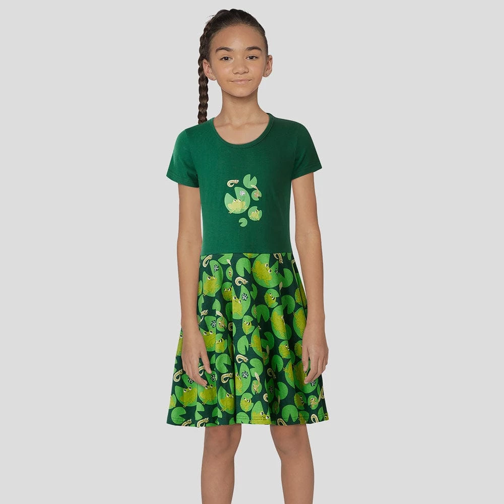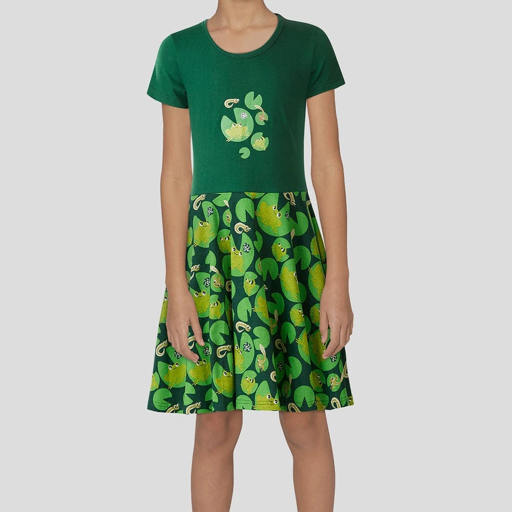 Jump into fun fashion! Frogs go through the stages of life in a process known as metamorphosis; they start as an egg, then grow into a tadpole, then a froglet, and finally, an adult frog. Isn’t this dress ribbiting?