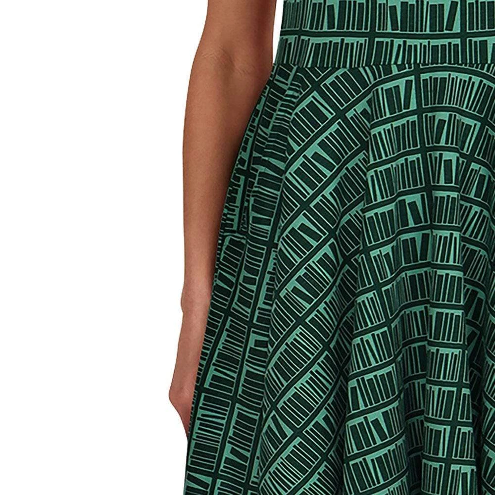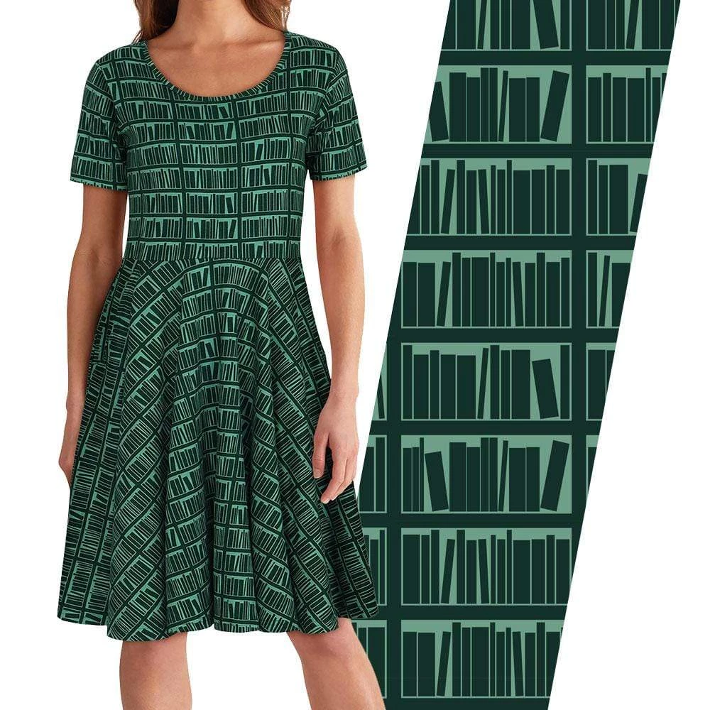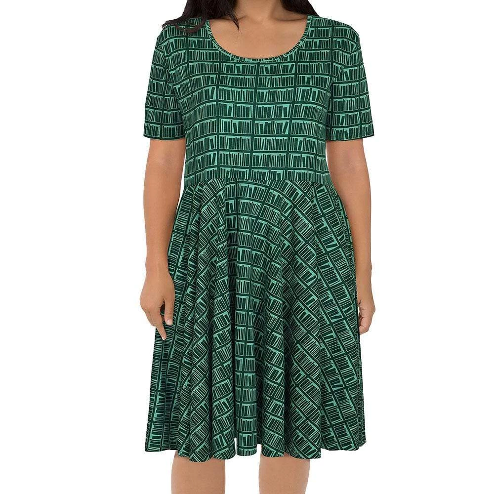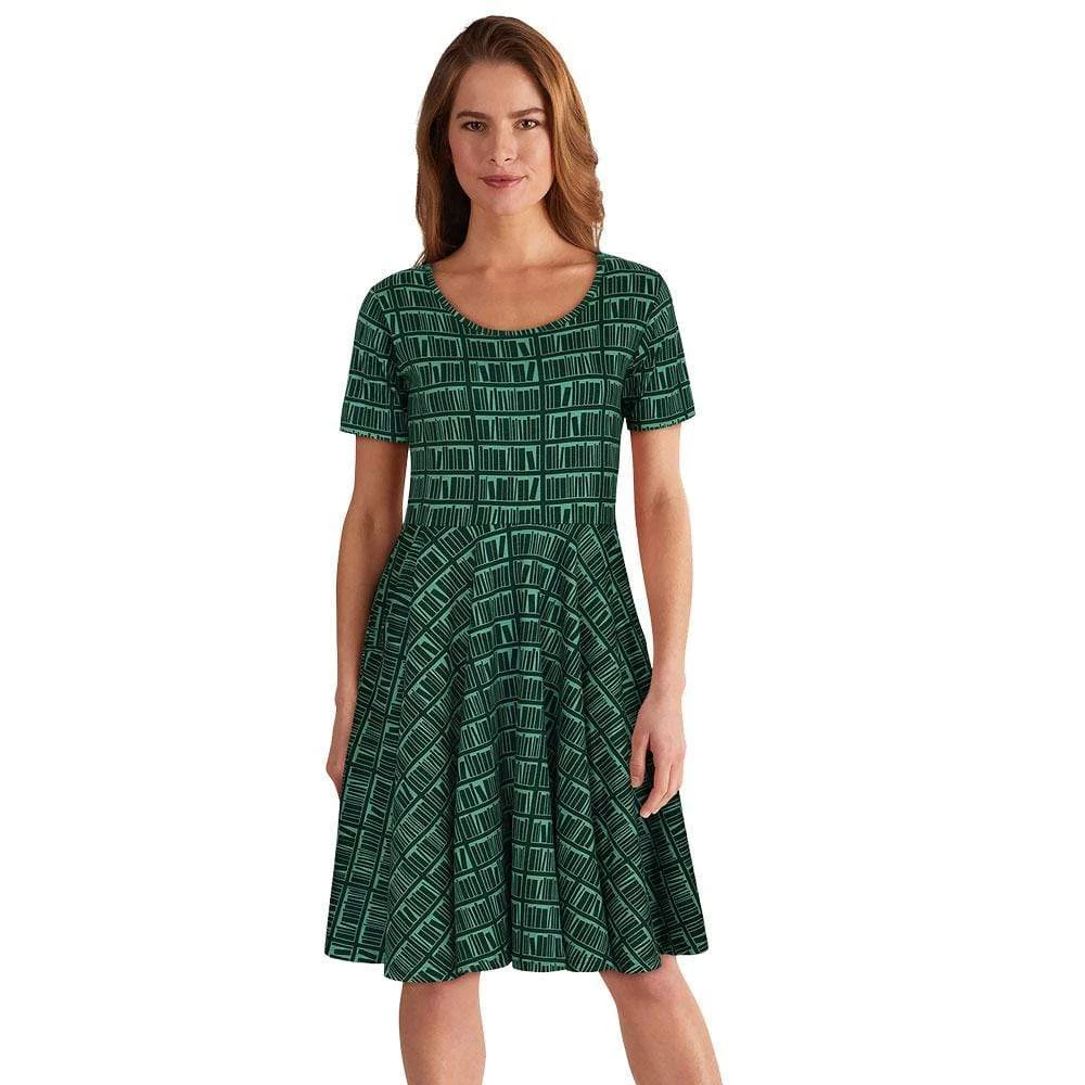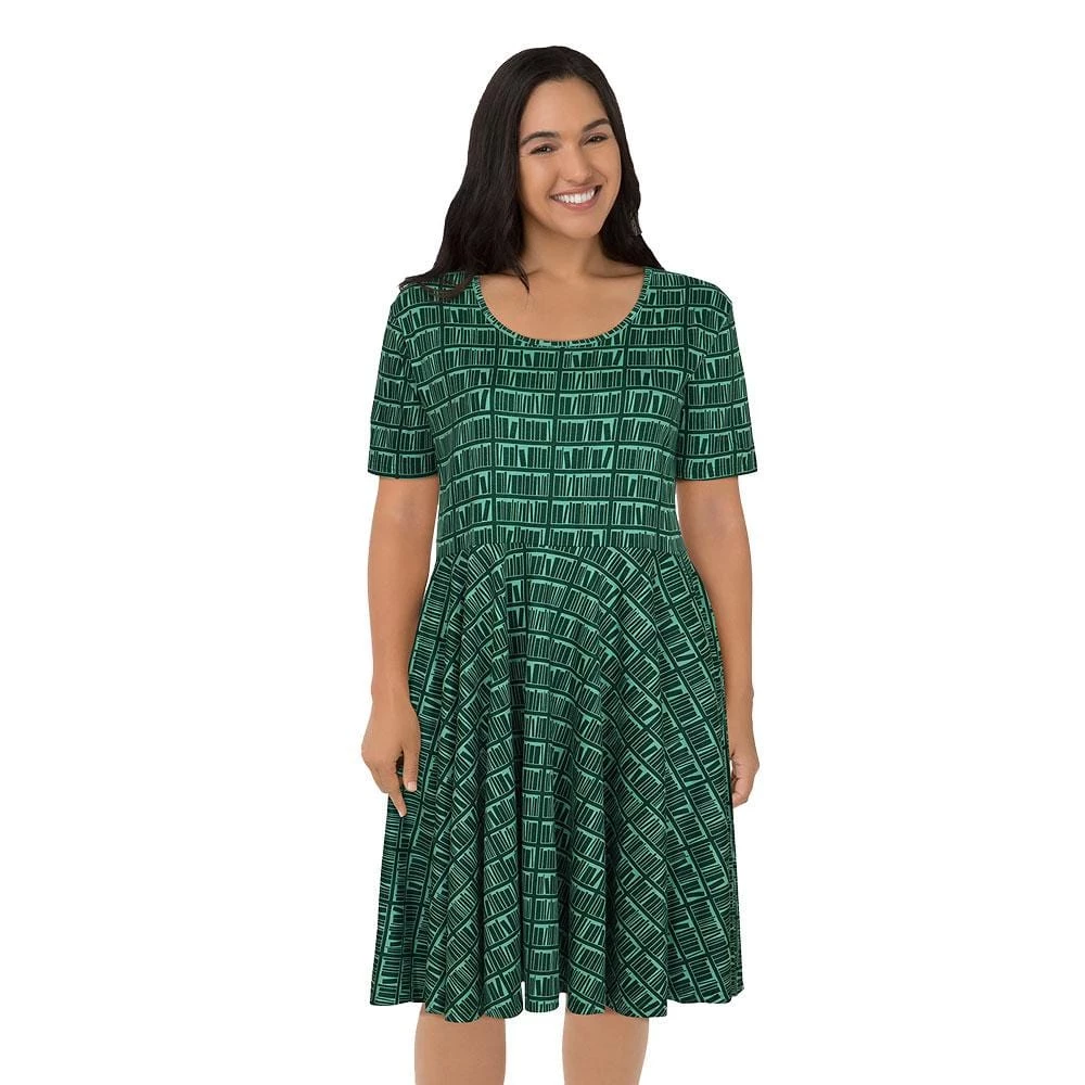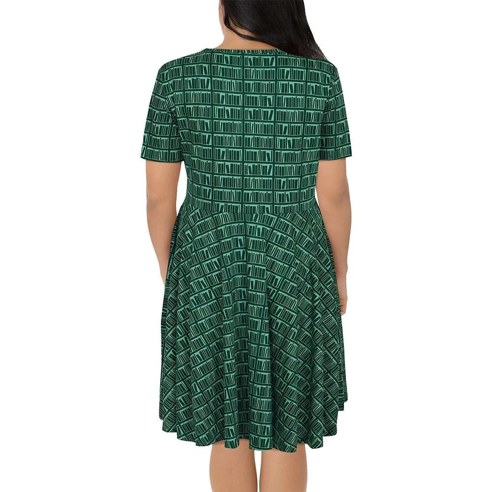 - Short-sleeve, adult dress with pockets, circle skirt, and scoop neckline