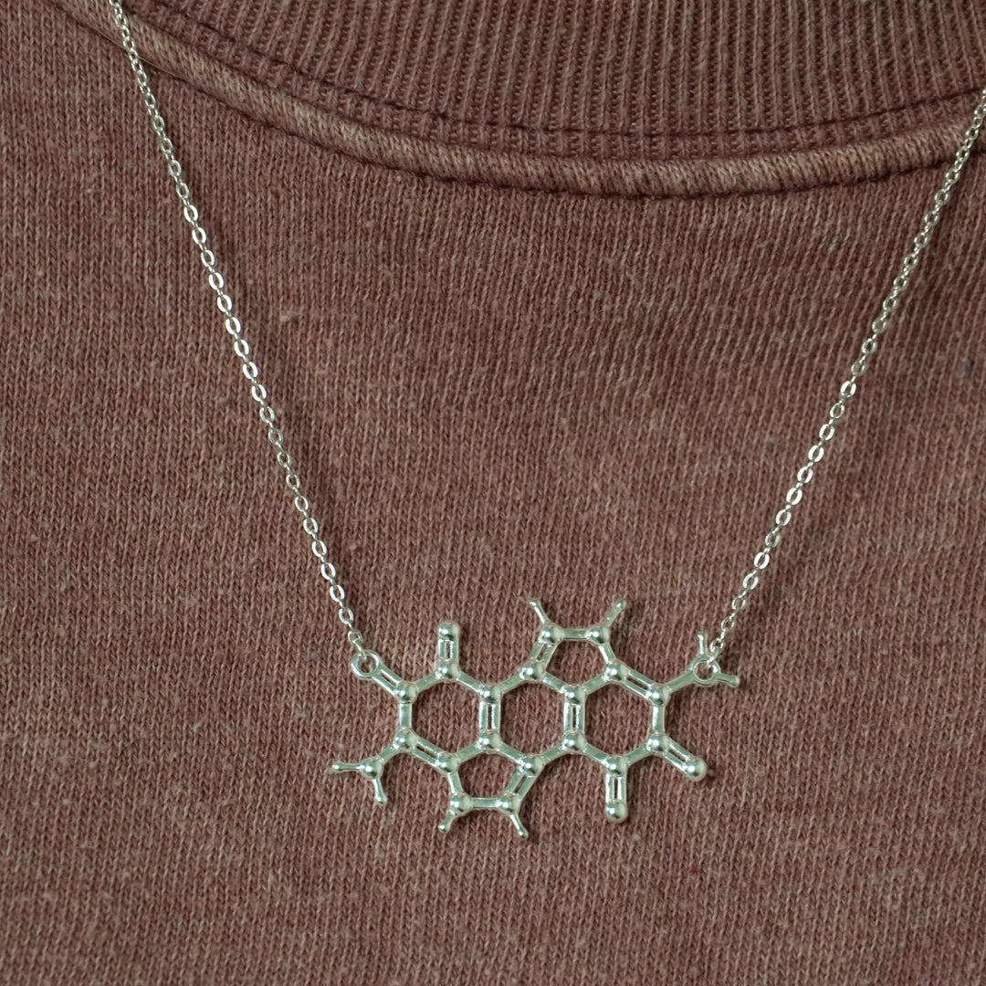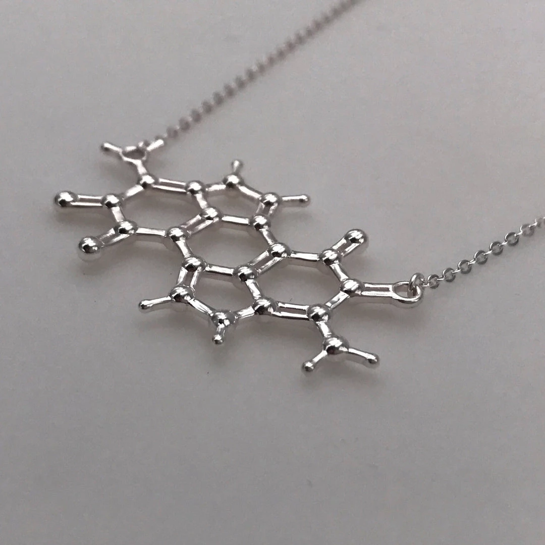 Handmade from Sterling Silver, this necklace represents the artistic representation of the molecular structure of Melanin. Melanin is a natural skin pigment and UV ray blocker that is responsible for the pigmentation that you see in hair, eyes, and skin.Â