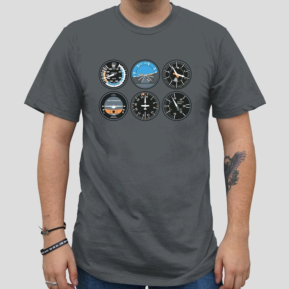 Scanning over the dials of an airplane? These airplane instruments are used to give the pilot information on the altitude, speed, turning, heading, and the climb and descent. The 6 basic aircraft dials include the airspeed indicator, the altimeter, the vertical speed indicator, the attitude indicator, the heading indicator, and the turn coordinator. Be prepared for take-off on your next adventure and reach new heights with this t-shirt!
