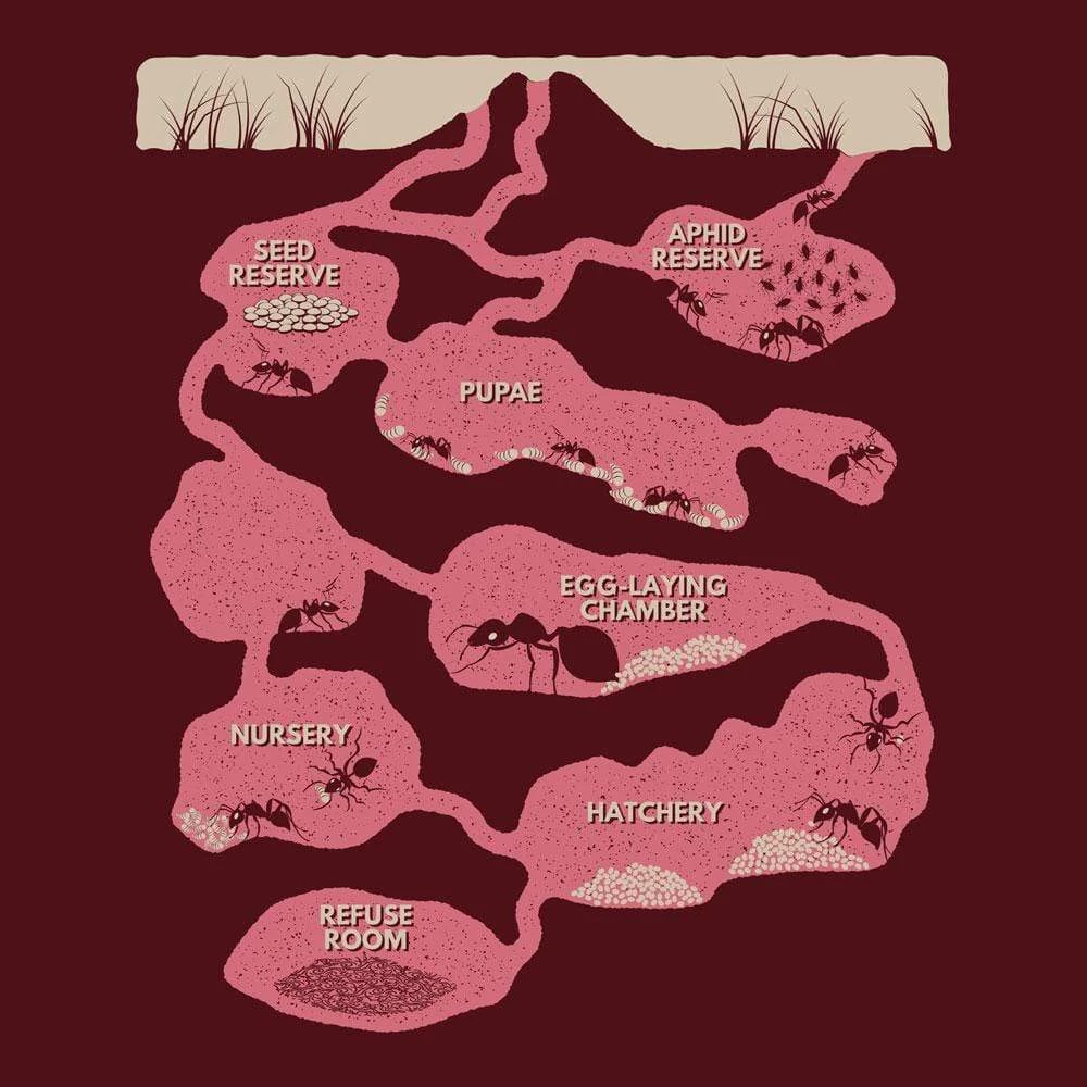 An ant colony starts with a queen ant and soon becomes full of worker ants, which then dig tunnels and create chambers that are used for many different purposes. Some of these chambers include the seed reserve, the aphid reserve, pupae, egg laying chamber, nursery, hatchery, and refuse room. No ant-ics here, this t-shirt is of great importance!