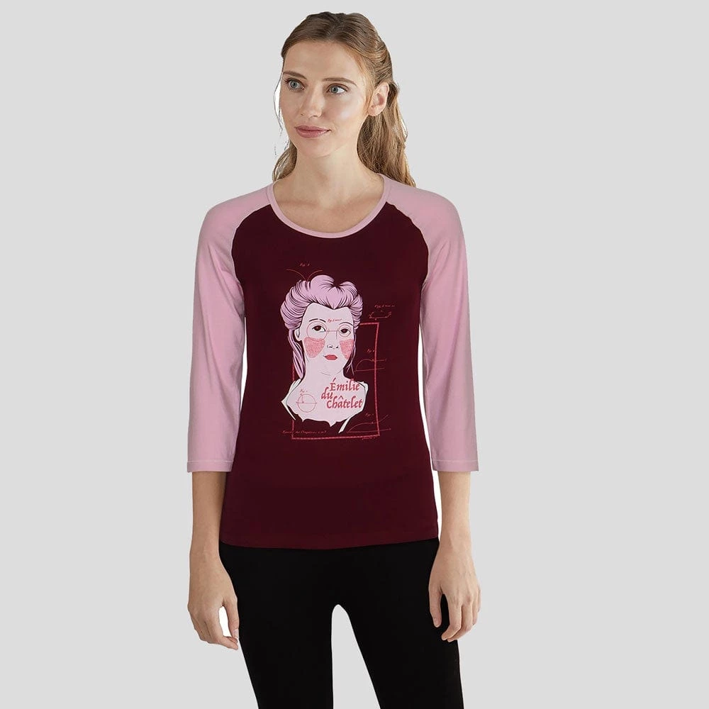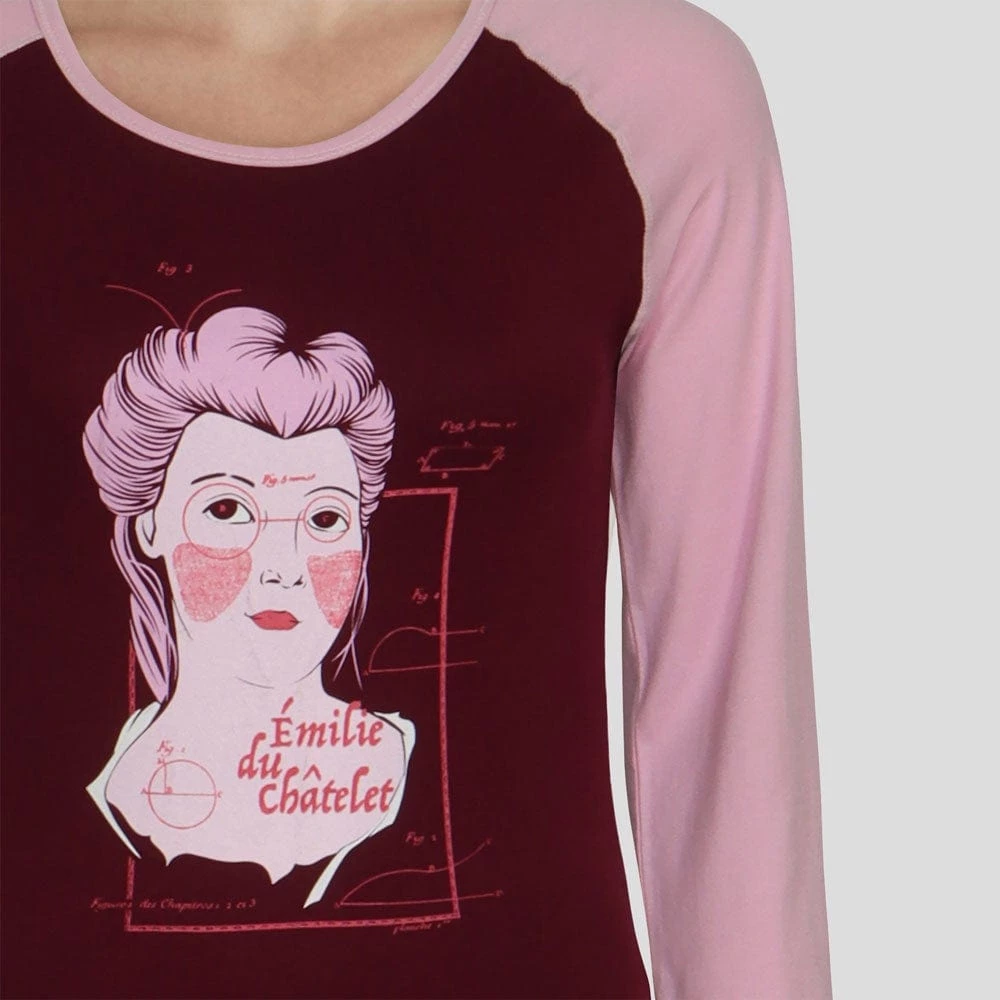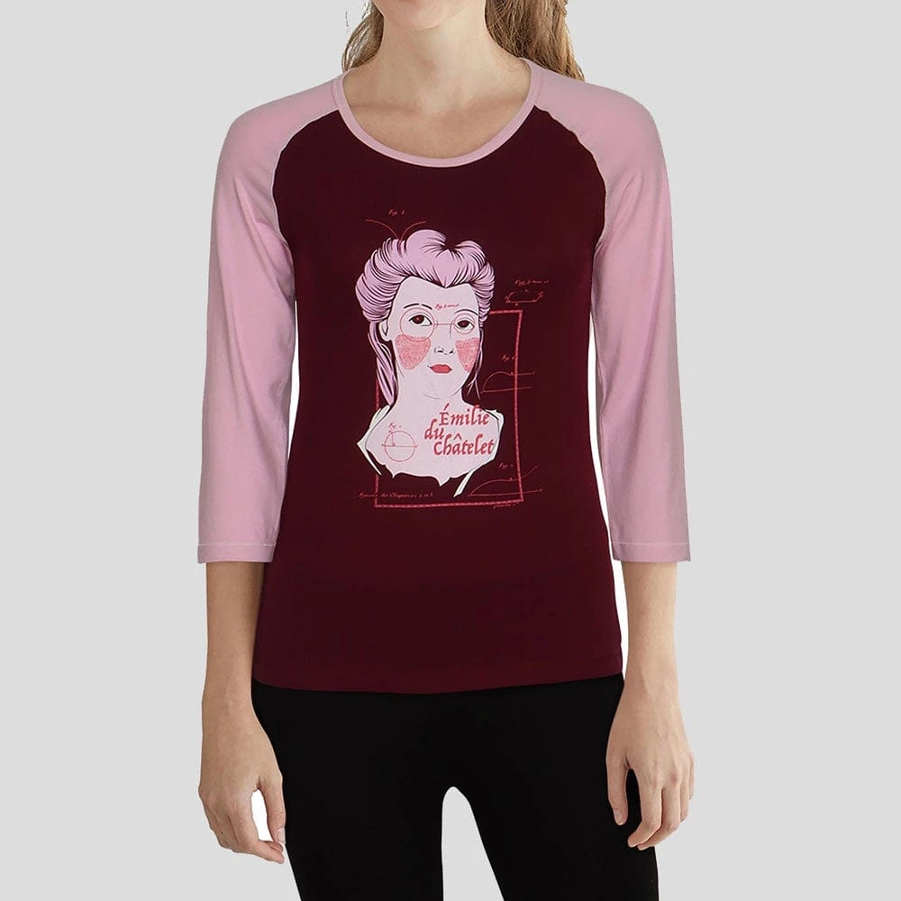 Émilie du Châtelet—French physicist, author, and mathematician—made contributions to the concept of energy conservation. She completed many translations of works including one on Newton’s Principia Mathematica, and she translated and wrote a significant number of other philosophical essays and books. Become enlightened and celebrate her achievements in this comfortable raglan tee!