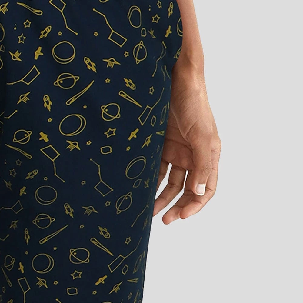 Take a look up at the night sky: what do you see? On a clear night, you might be able to see our moon, twinkling stars, one of our neighboring planets, a satellite, or maybe, dare I say it, a UFO (we’re holding out hope). There are so many great wonders in our solar system and systems beyond our own. It may not be possible to fit everything the universe has to offer on one garment, but you can still show off the ones that are visible to the naked eye in this stunning pattern.