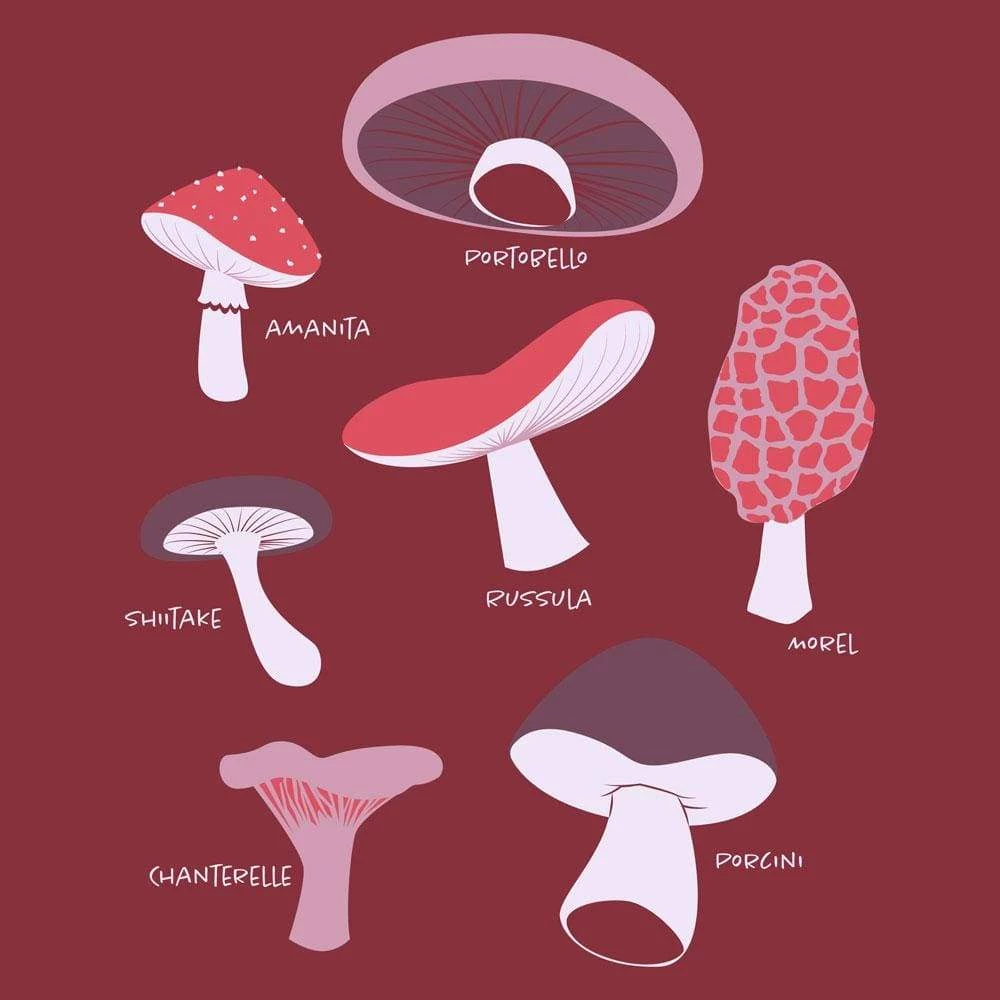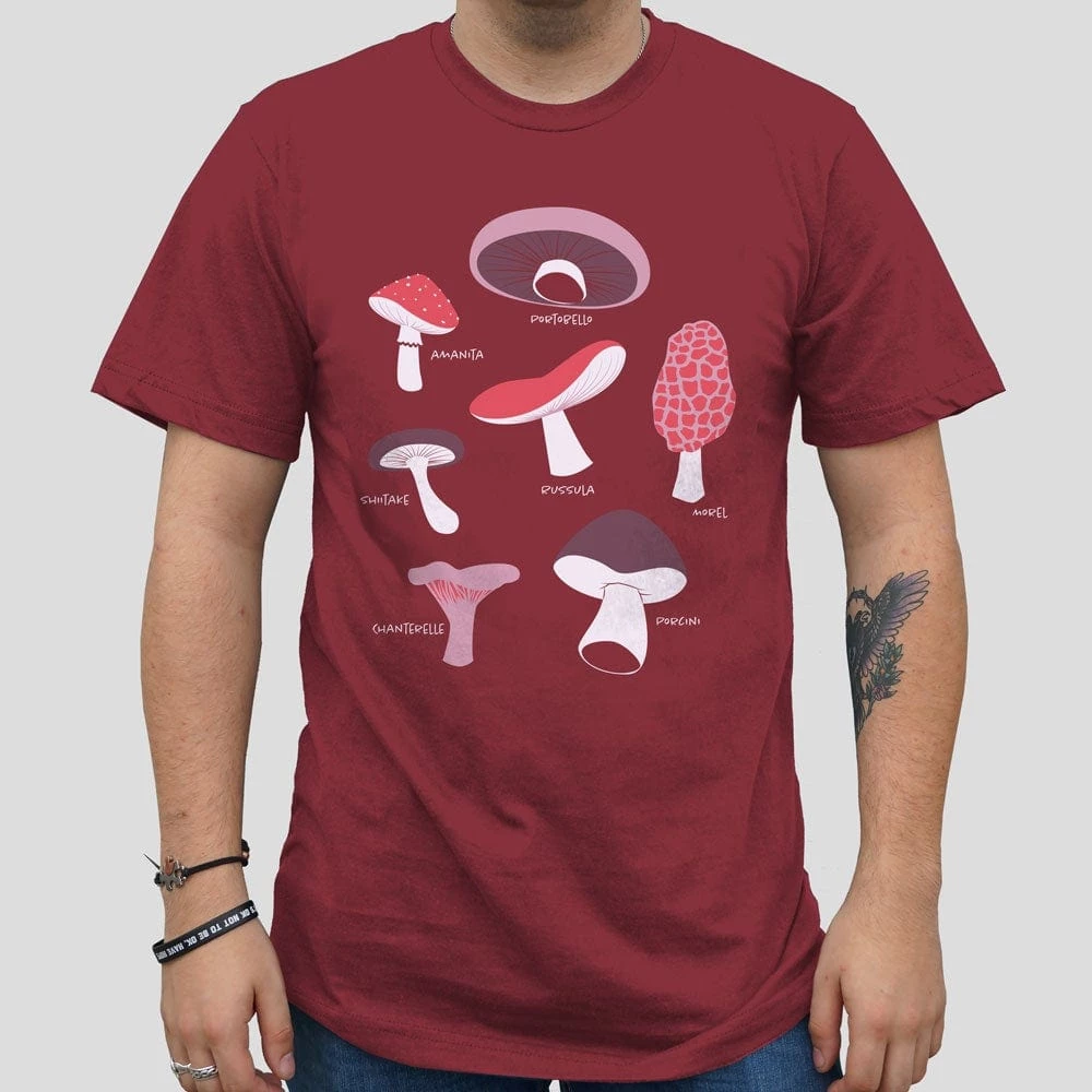 Do you have mush-room in your closet for another magical t-shirt? Some mushrooms include the portobello, amanita, shiitake, russula, morel, chanterelle, and porcini. From wild to cultivated mushrooms, this t-shirt provides variety and fun!