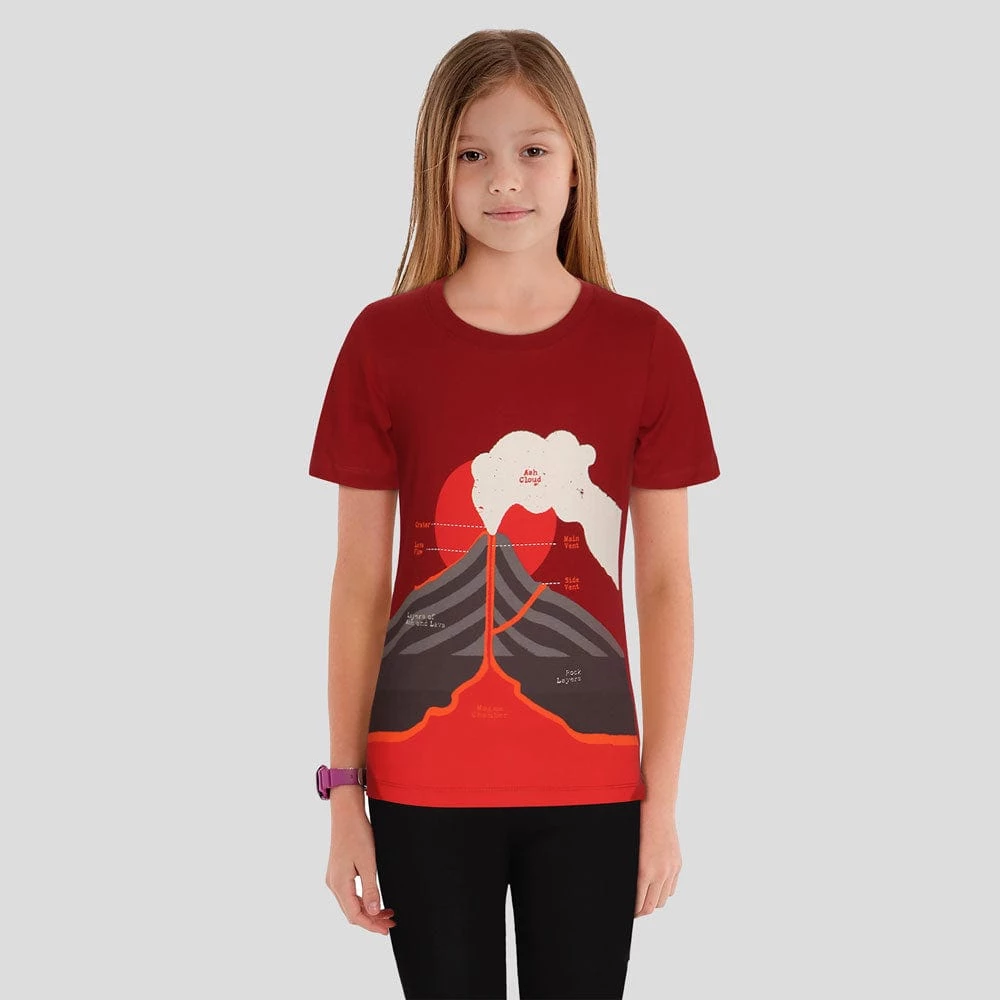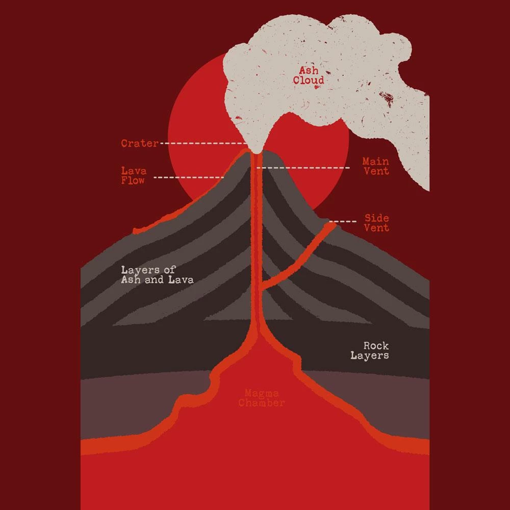 - T-shirt includes ash cloud, crater, lava flow, main vent, side vent, layers of ash and lava, rock layers, and magma chamber