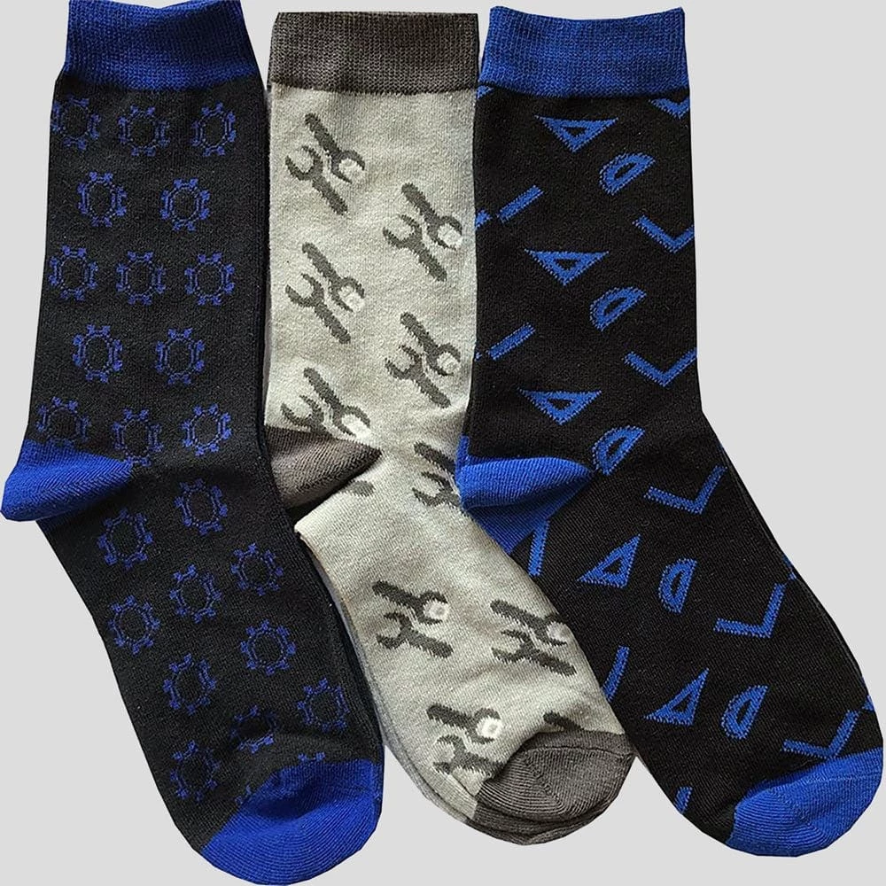 - Includes 3 pairs of engineering-themed socks