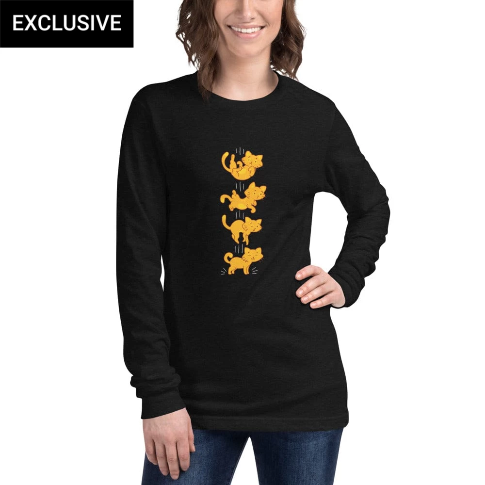 A cat always falls on its two feet! We wish the grown up did that too! Enrich your wardrobe with a versatile long sleeve tee. For a casual look, combine it with your favorite jeans, and layer it with a button-up shirt, a zip-up hoodie, or a snazzy jacket. Dress it up with formal trousers or chinos to achieve a more professional look.