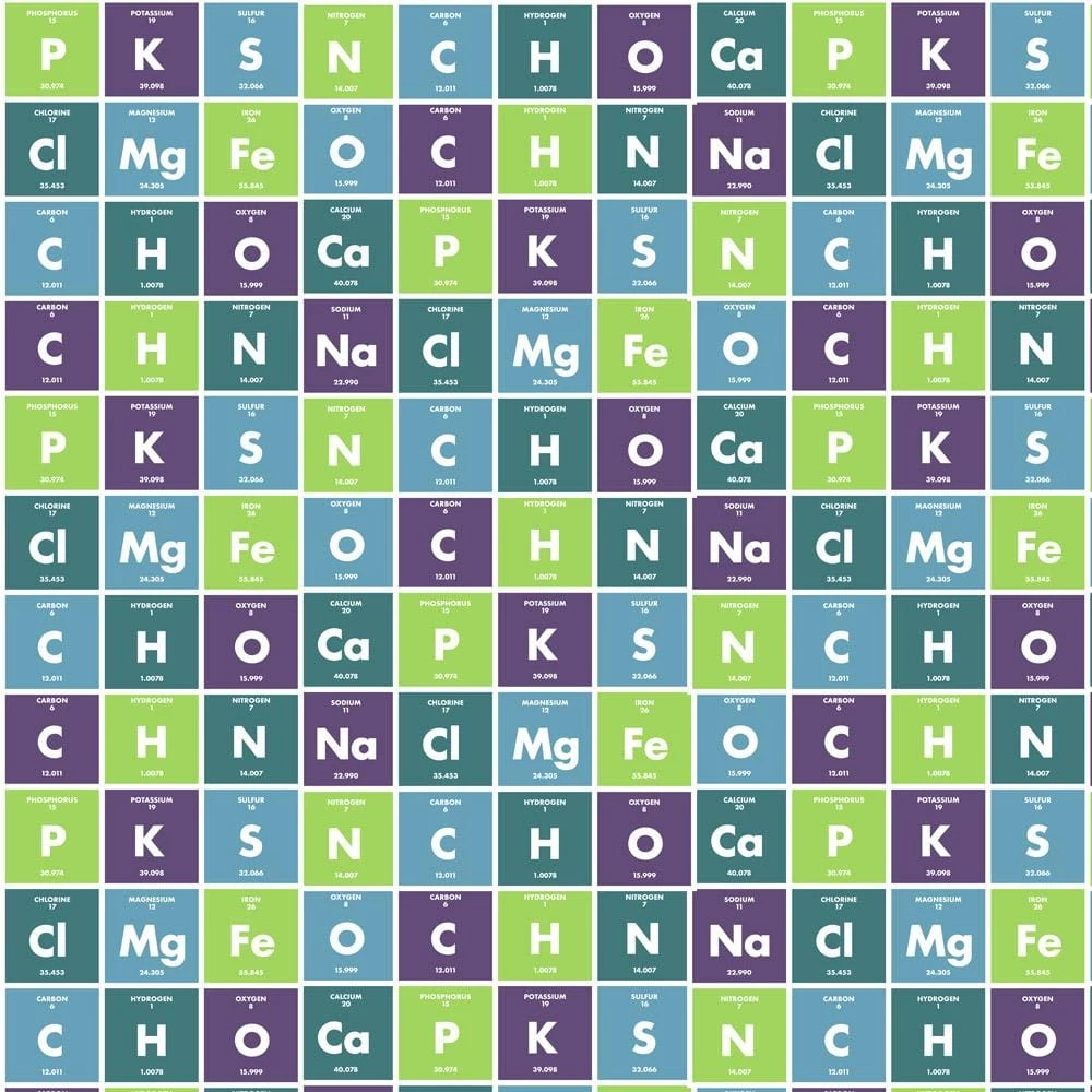 - Screen-printed with chemistry-inspired periodic table human body elements all-over-print design