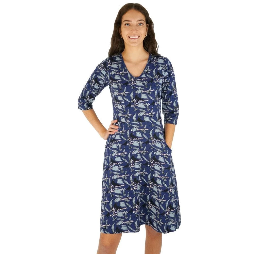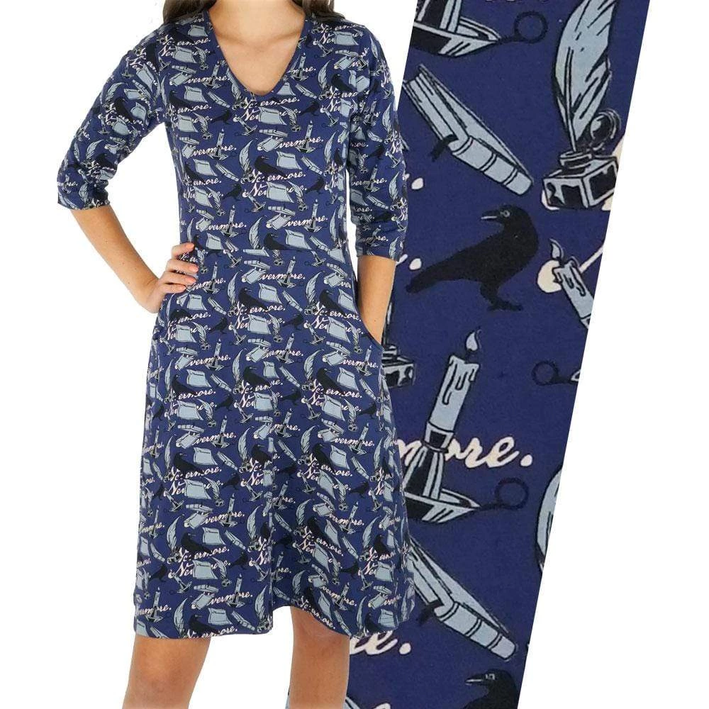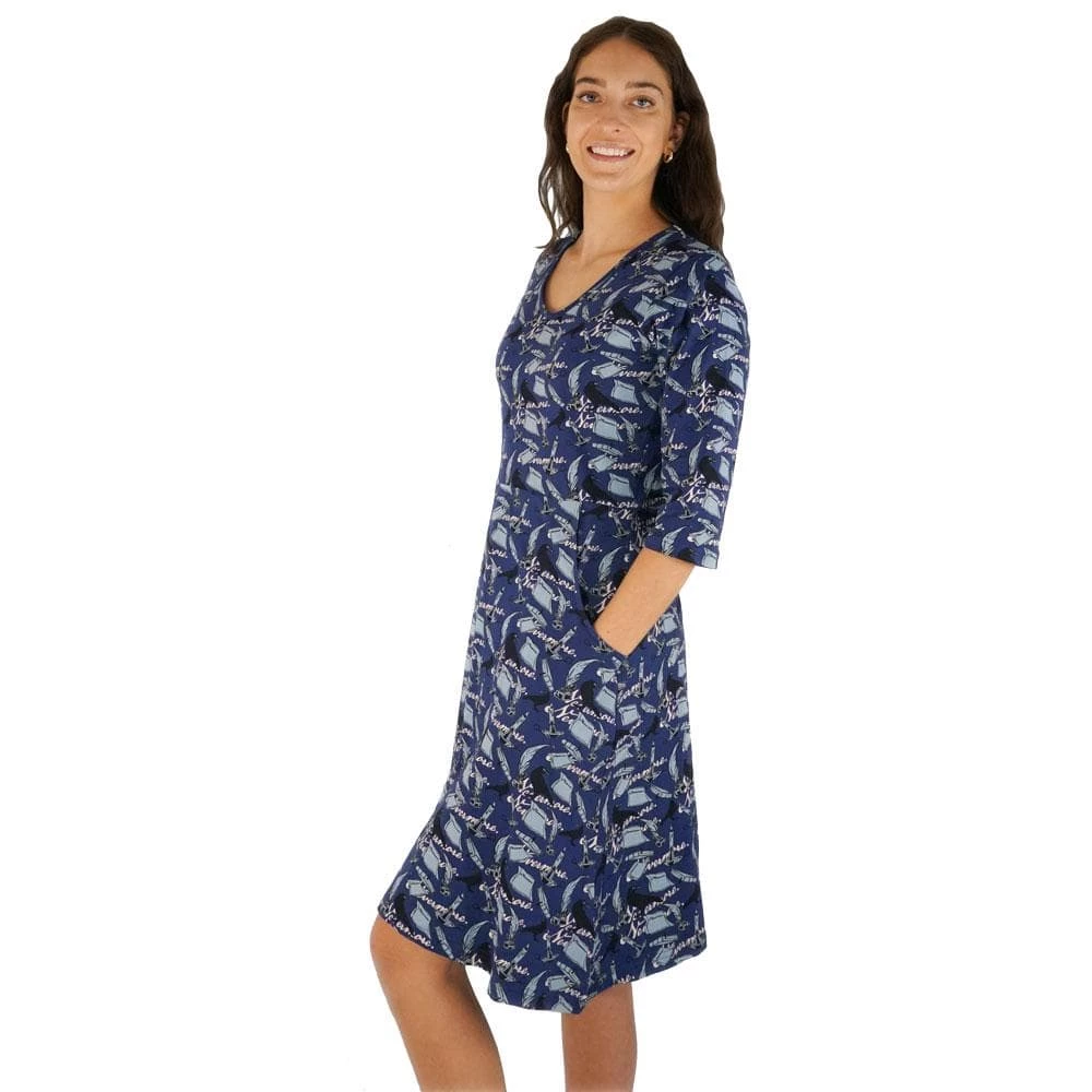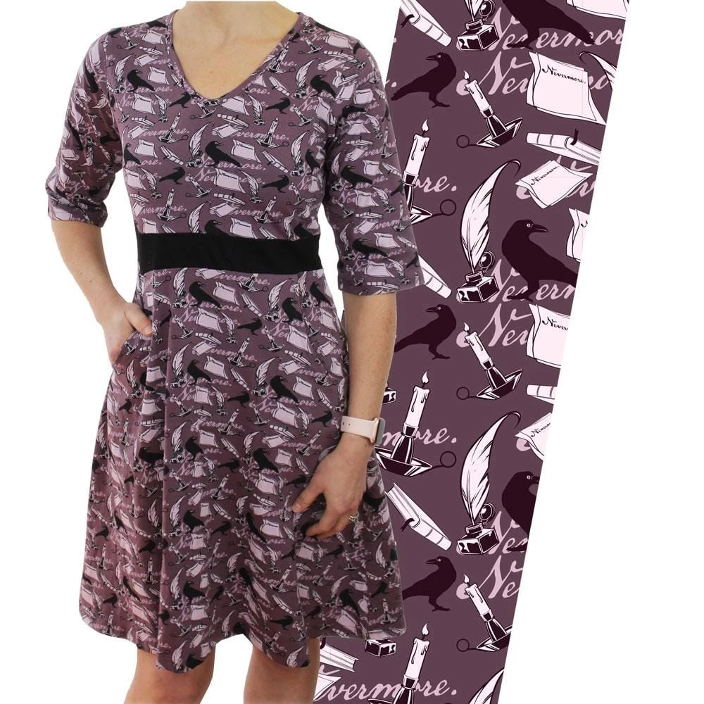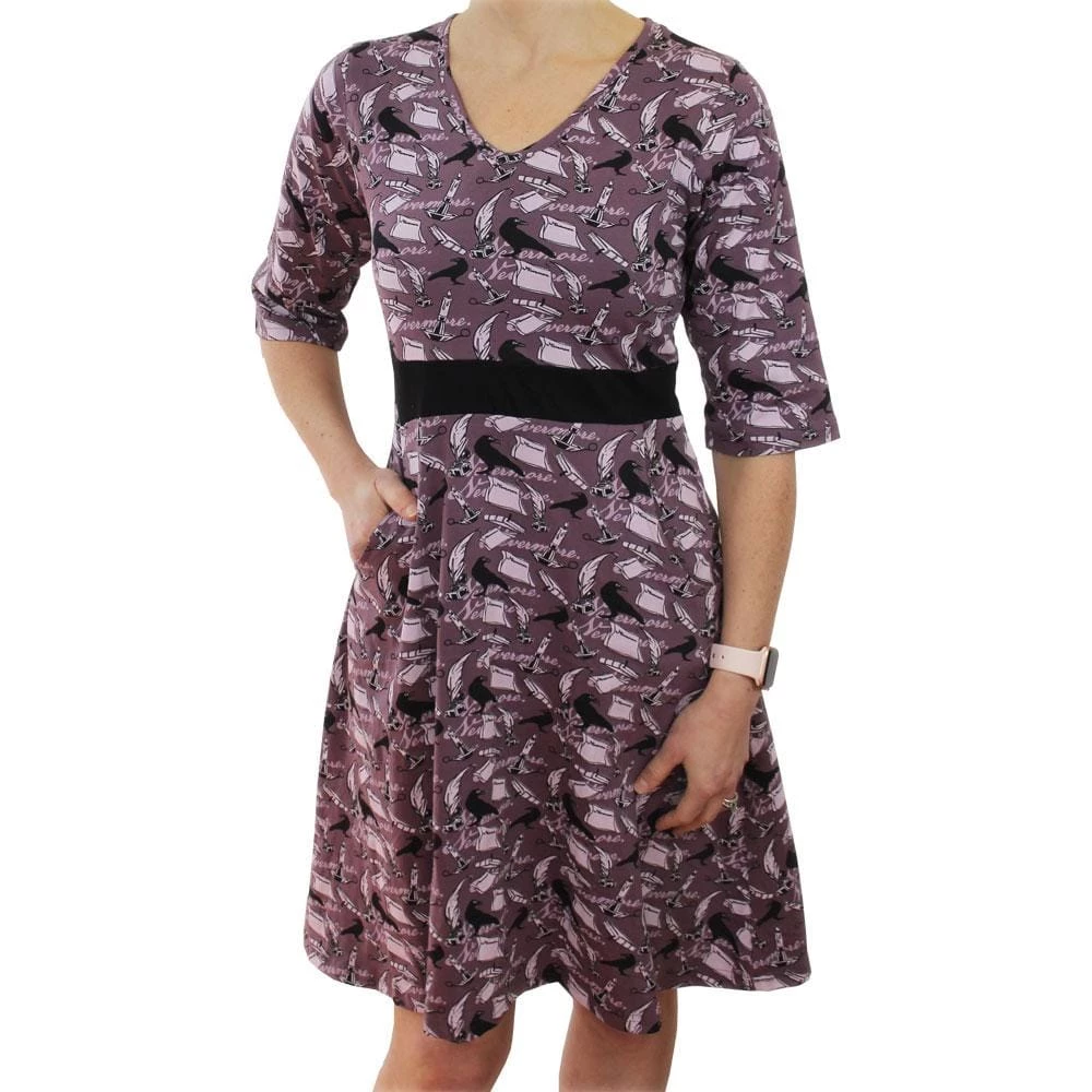 This mauve, organic cotton, dress features a scooped V-neckline, black waistband, 3/4 length sleeves, and with pockets. Available in adult sizes XS-5X.