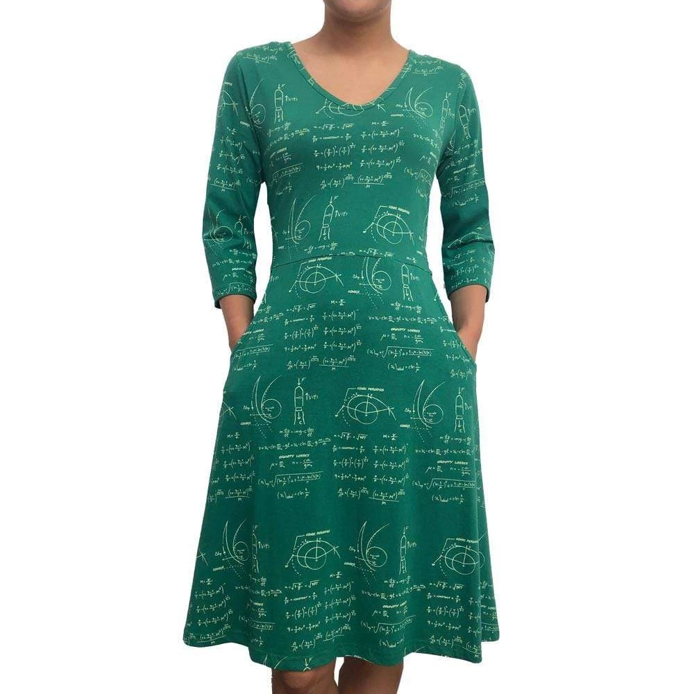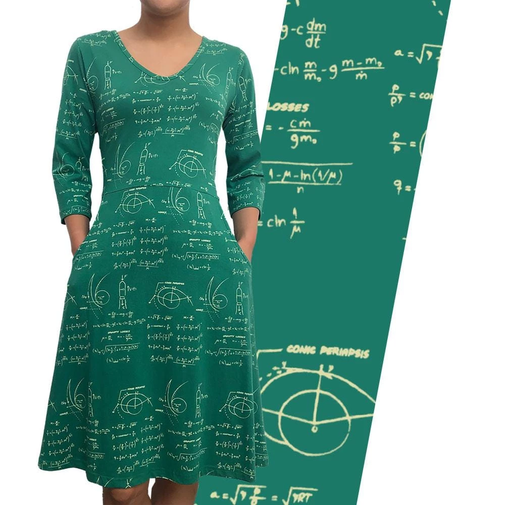 This STEM printed dress with pockets pays homage to Katherine Johnson, the fabulous African-American mathematician who was largely responsible for sending the astronauts on the Apollo 11 safely into space. Hollywood thought the female mastermind’s story was also inspiring and turned it into the Blockbuster hit, Hidden Figures. Johnson scribbled her fancy scientific calculations on a blackboard. This dress contains the secrets of gravity losses, simulates rocket propulsion, and is right up the alley of any stargazer!