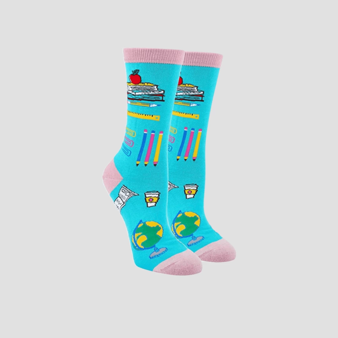 - Light blue with books, pencils, paper clips, ruler, and globe design