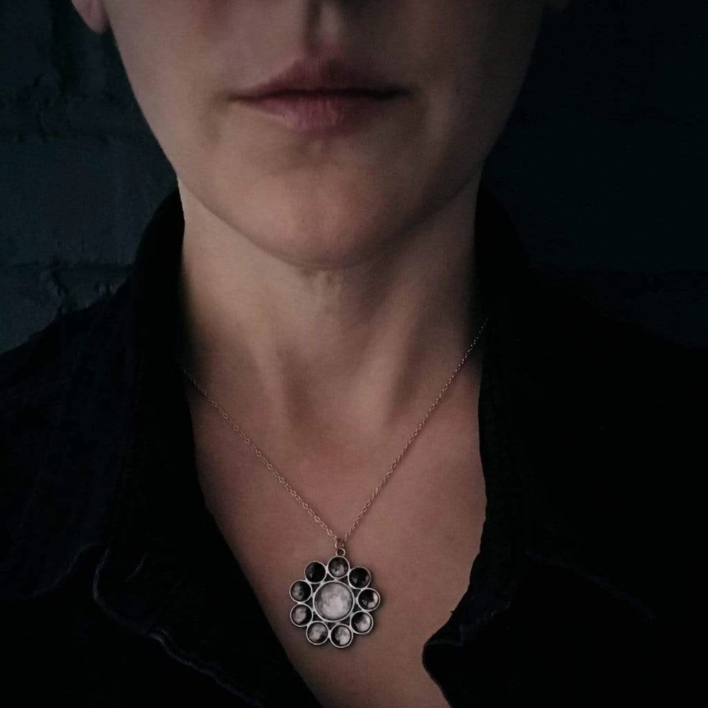The phase of the moon is in constant flux. Celebrate the entire lunar cycle with this simple and striking halo pendant necklace! Silver tone and halo style, this is set with a full moon in the center surrounded by 9 phases of the moon. A perfect gift for the stargazer or nature lover in your life!